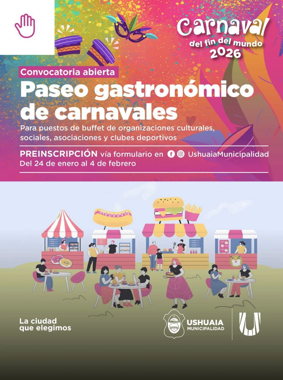 En el marco del Carnaval del Fin del Mundo 2026, la Secretaría de Cultura y Educación de la Municipalidad de Ushuaia informa a la comunidad que inicia la convocatoria de preinscripción al Paseo Gastronómico de carnavales.