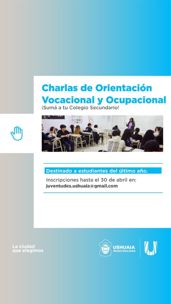 Para conocer más sobre las Charlas de Orientación Vocacional y Ocupacional, las y los interesados podrán contactarse al correo juventudes.ushuaia@gmail.com.