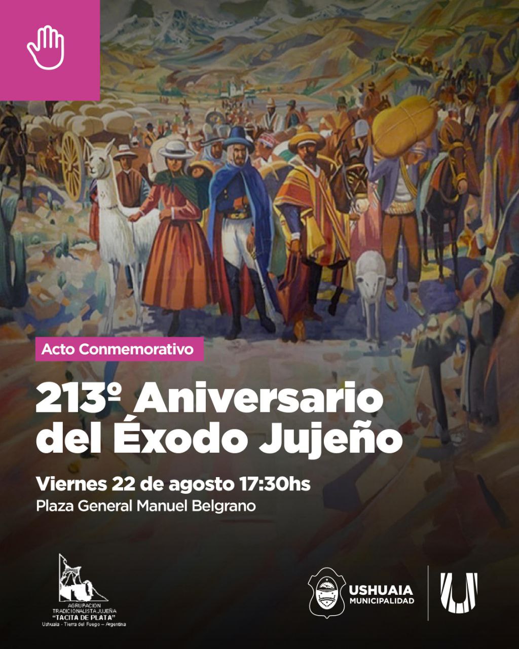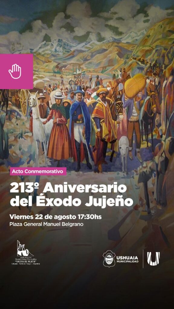 La Secretaría de Cultura y Educación de la Municipalidad de Ushuaia acompañará este viernes 22 en la Plaza General Manuel Belgrano a las 17:30 el acto conmemorativo del 213° Aniversario del Éxodo Jujeño.