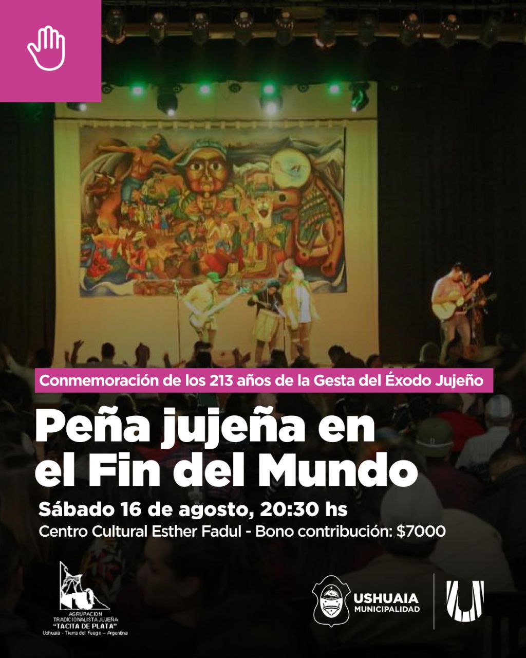 La Secretaría de Cultura y Educación de la Municipalidad de Ushuaia acompañará este sábado 16 de agosto a partir de las 20:30 horas en el Centro Cultural Esther Fadul la “Peña Jujeña en el Fin del Mundo”.