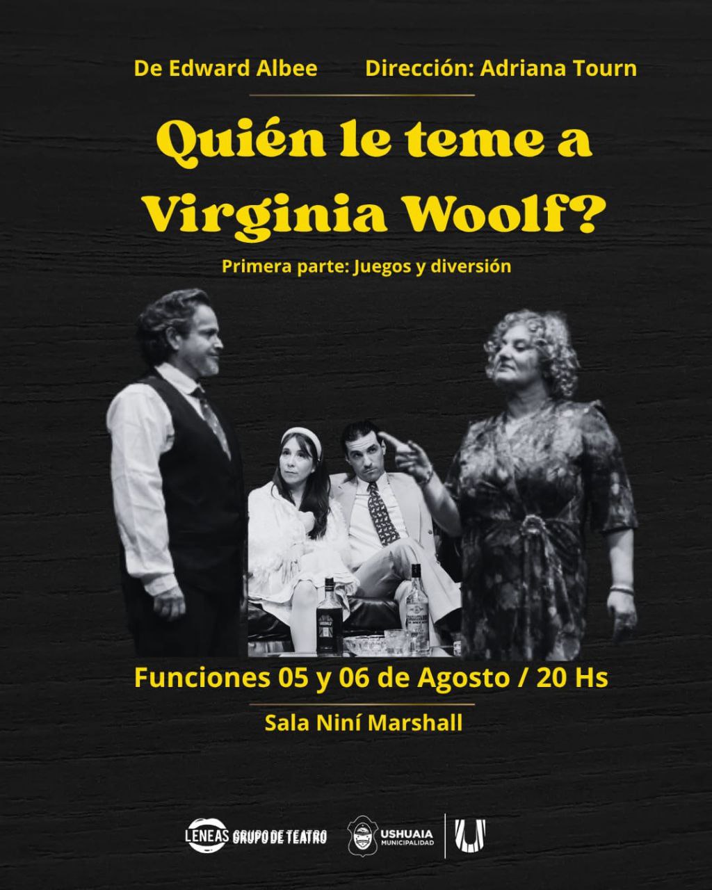 La Secretaría de Cultura y Educación de la Municipalidad de Ushuaia acompañará este martes 5 y miércoles 6 de agosto a las 20:00 horas en la Sala Niní Marshall de la Casa de la Cultura la presentación de la obra teatral “Quien le teme a Virginia Woolf” por Leneas Grupo de Teatro.