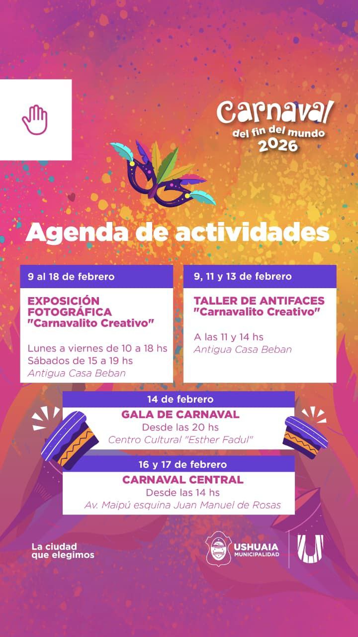 Quiénes deseen conocer más sobre el cronograma de actividades del “Carnaval del Fin del Mundo 2026” podrán visitar las redes sociales de la Municipalidad de Ushuaia y la Secretaría de Cultura y Educación en @UshuaiaMunicipalidad y @culturayeducacionush.