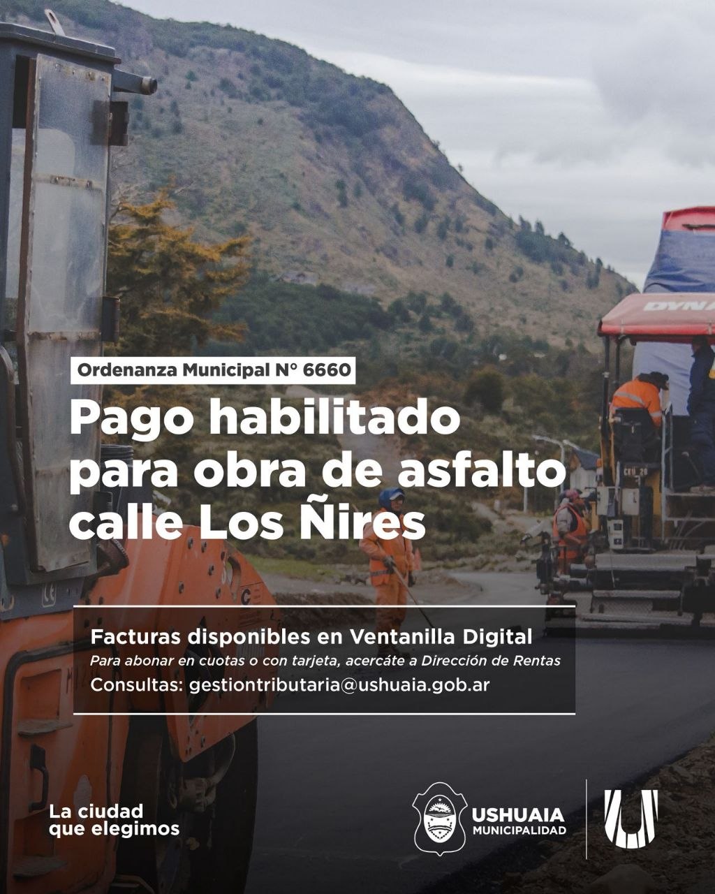 La Municipalidad de Ushuaia informa a los vecinos y vecinas del sector de calle De Los Ñires que ya se encuentran habilitadas las facturas correspondientes a la obra de pavimentación, en el marco de la Ordenanza Municipal N° 6660.