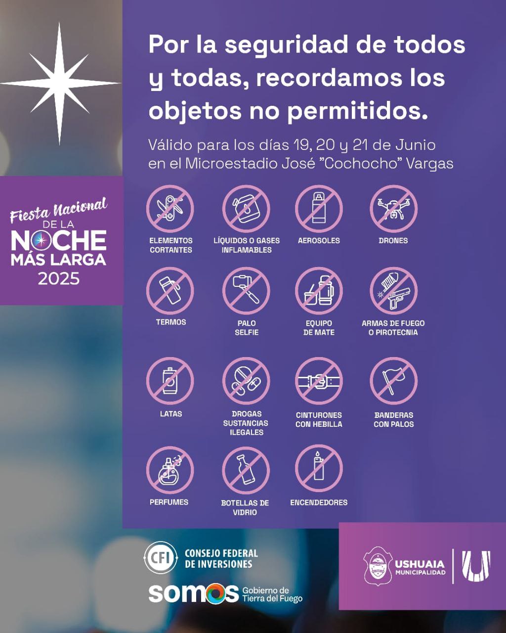 En el marco de la Fiesta Nacional de la “Noche Más Larga 2025”, la Municipalidad de Ushuaia informa a la comunidad sobre los elementos no permitidos para la entrada al Microestadio José “Cochocho” Vargas para la Noche de Folklore con Abel Pintos el día jueves 19, la Noche Tropical el día viernes 20 y la Noche de Rock con Dillom el sábado 21.