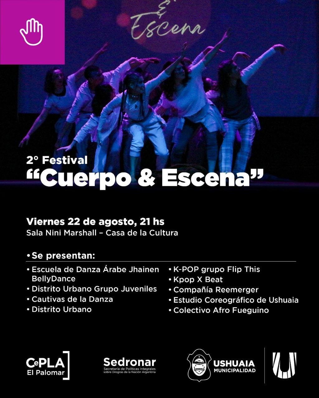 La Municipalidad de Ushuaia, a través de la Secretaría de Políticas Sociales, Sanitarias y Derechos Humanos, invita a vecinos y vecinas de la ciudad a sumarse a la segunda edición del Festival Cuerpo & Escena, un espacio de celebración, arte y encuentro colectivo que tendrá lugar el viernes 22 y el sábado 23 de agosto.