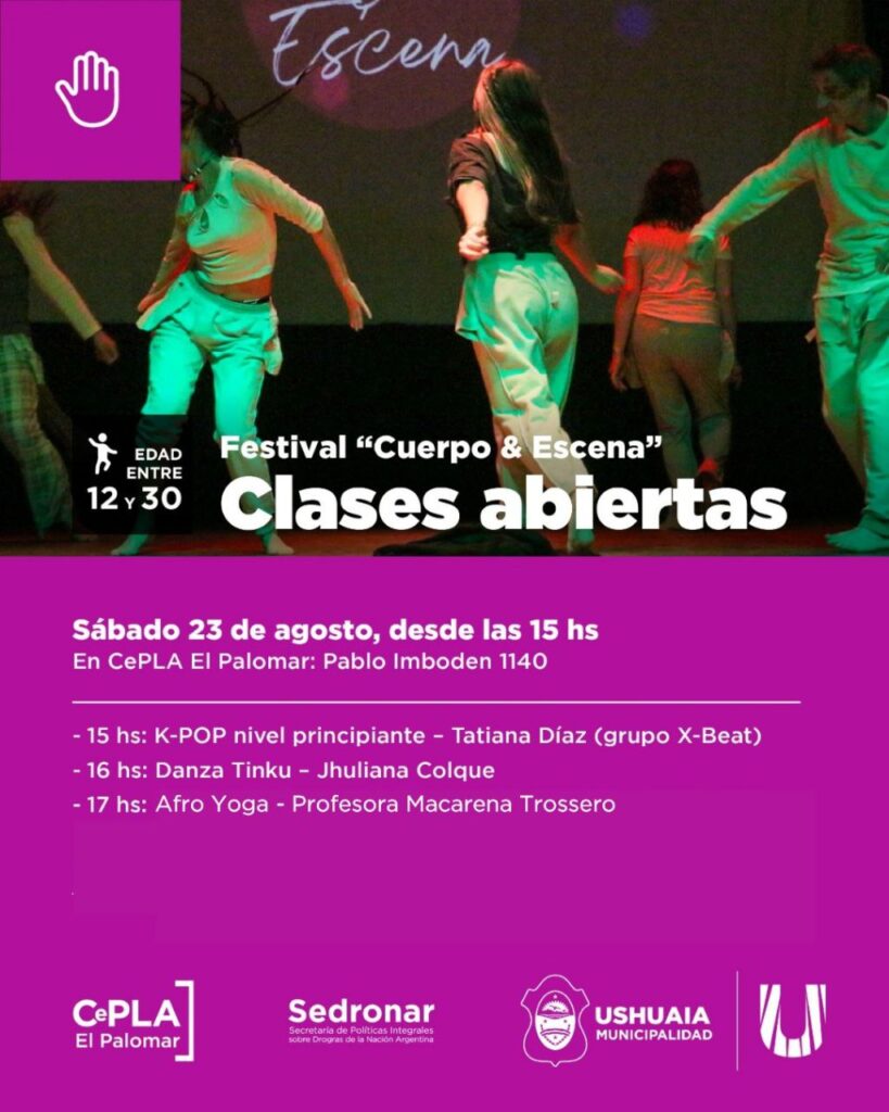 El sábado la actividad continuará en el CePLA – El Palomar, ubicado en Pablo Imboden 1140, con una jornada de clases abiertas destinada a jóvenes de entre 12 y 30 años. La propuesta comenzará a las 15 con una clase de K-POP para nivel principiante a cargo de Tatiana Díaz, integrante del grupo X-Beat. A las 16 se dictará una clase de Danza Tinku a cargo de Jhuliana Colque, mientras que a las 17 será el turno del AfroYoga con Macarena Trossero. La jornada finalizará a las 18 con una clase general también dictada por Trossero.