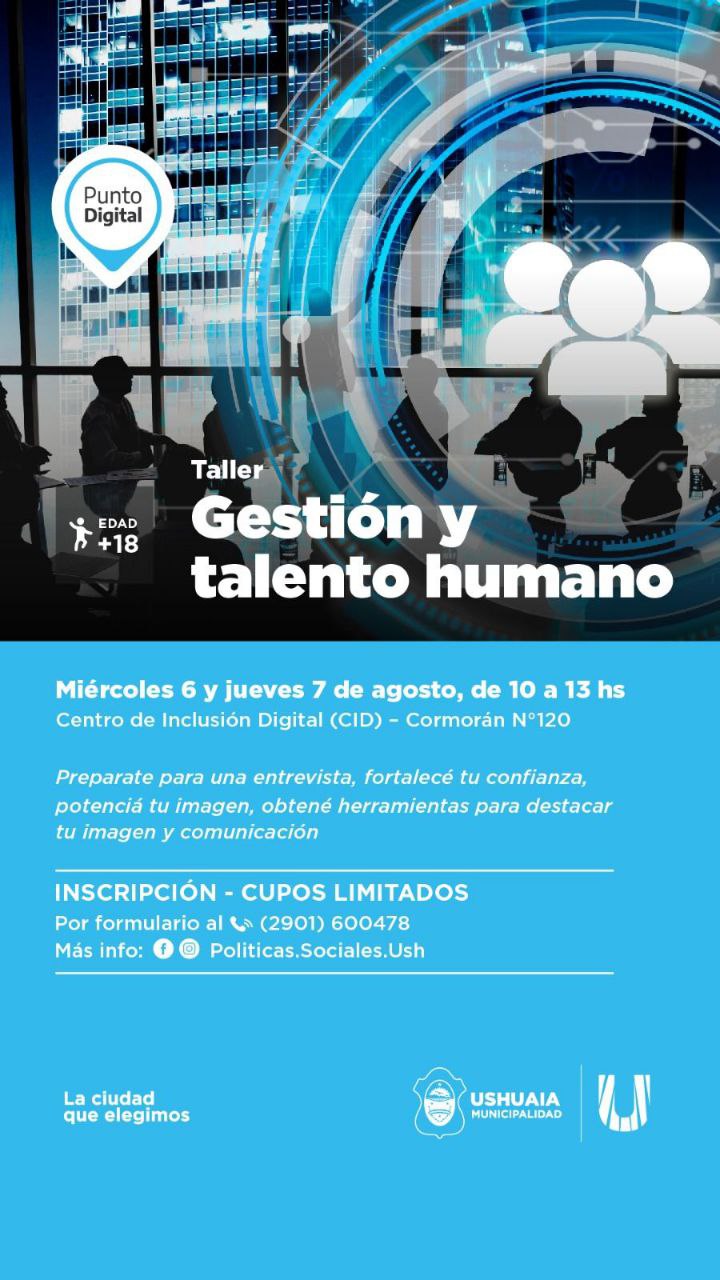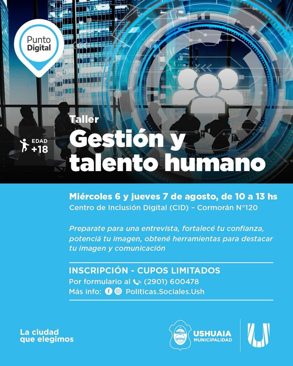 La Municipalidad de Ushuaia, a través de la Secretaría de Políticas Sociales, Sanitarias y Derechos Humanos, invita a participar del taller gratuito “Gestión y Talento Humano”, organizado por el equipo de Punto Digital Ushuaia.