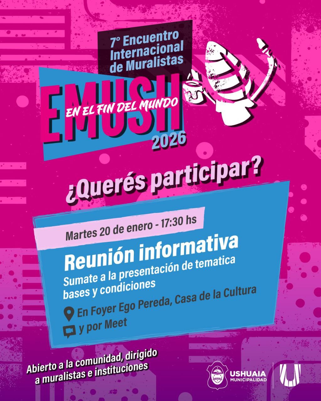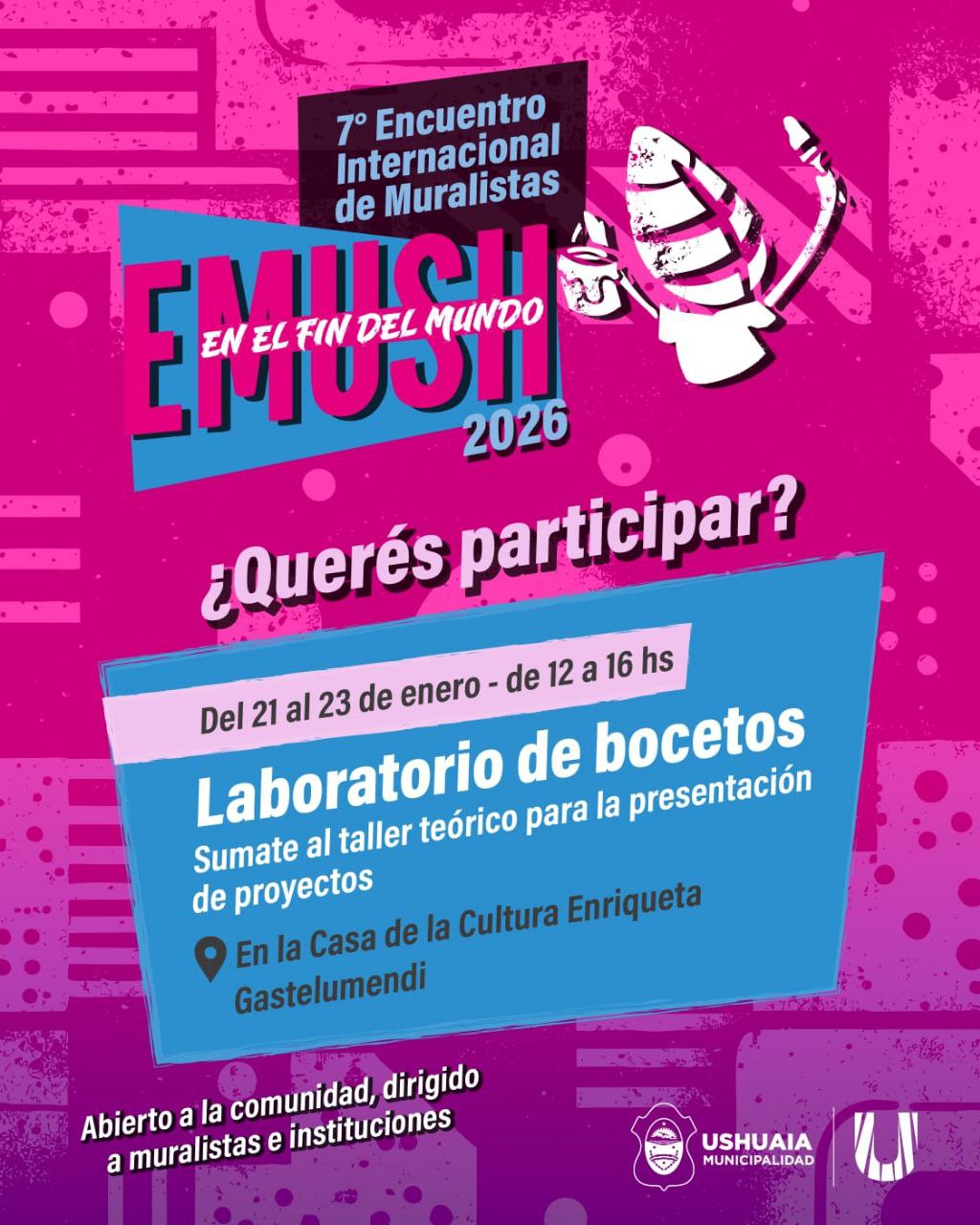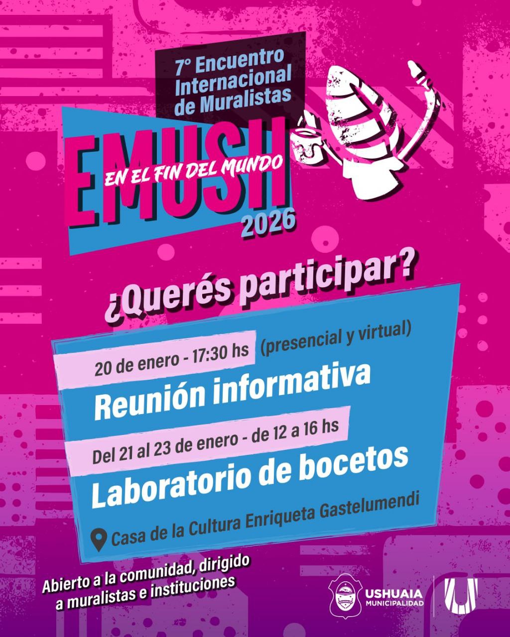 Quiénes deseen conocer más sobre el 7° Encuentro Internacional de Muralistas en el Fin del Mundo EMUSH 2026, podrán acceder a las Bases y Condiciones del mismo en: https://acortar.link/Wo1L5E , así como realizar la inscripción en: https://acortar.link/fOXiAw hasta el 31 de enero, pudiendo también visitar las redes sociales de la Municipalidad y la Secretaría de Cultura y Educación en @UshuaiaMunicipalidad y @culturayeducacionush respectivamente.