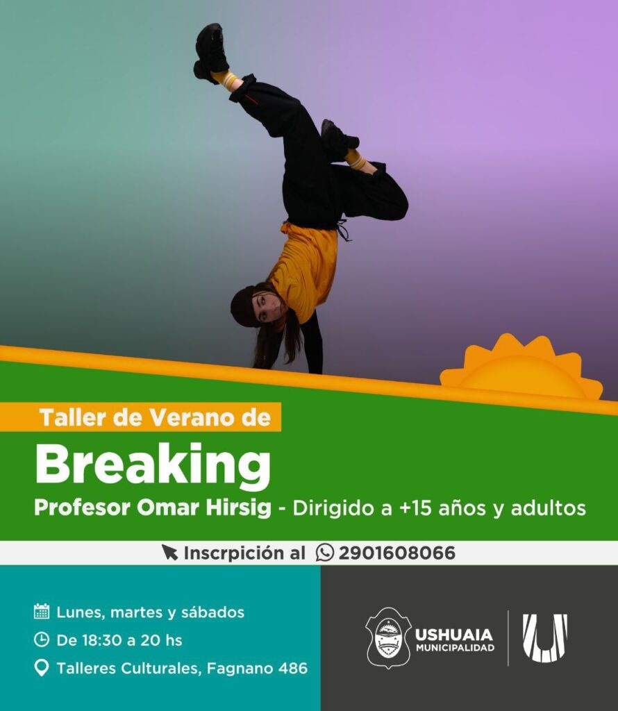 Finalizando la propuesta danzas estará el taller de Breaking por Omar Hirsig destinado a mayores de adolescentes mayores de 15 años y adultos con clases los días lunes, martes y sábado de 19:30 a 20:00 horas en el espacio de talleres culturales municipales.