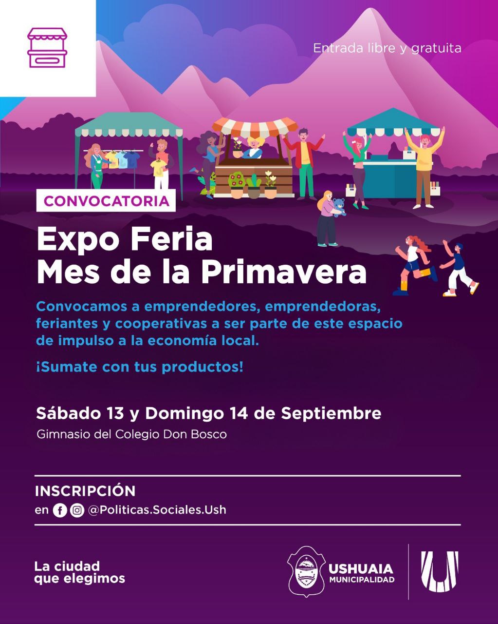 La Municipalidad de Ushuaia, a través de la Secretaría de Políticas Sociales, Sanitarias y Derechos Humanos y la Secretaría de Economía y Finanzas, invita a la comunidad a disfrutar de una nueva edición de la Expo Emprendedores, en el marco de los festejos por el Mes de la Primavera.