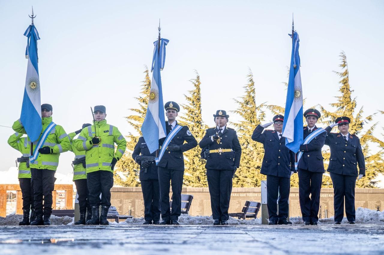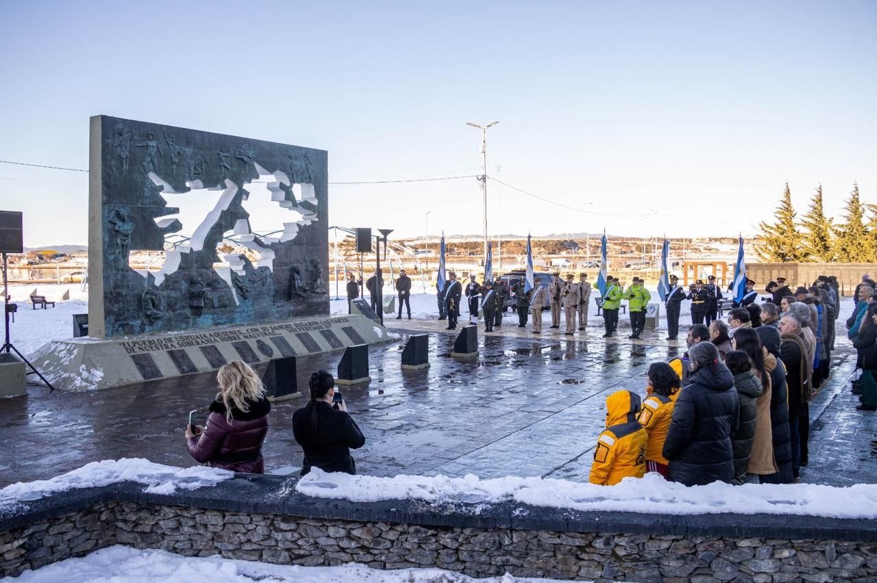 La vice intendenta de la Municipalidad de Ushuaia, Gabriela Muñiz Siccardi junto al secretario de Relaciones Parlamentarias y Articulación Política, Omar Becerra e integrantes del Centro de Ex Combatientes de Malvinas en Ushuaia, autoridades del Gobierno Provincial, de las Fuerzas Armadas, de Seguridad y público en general, participaron del acto en conmemoración del Día Provincial de la Integridad Territorial Argentina, al cumplirse el 505° Aniversario de la creación de la primera cartografía de las Islas Malvinas.