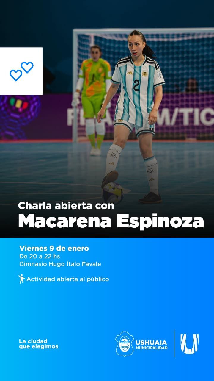 El Instituto Municipal de Deportes invita a los vecinos y vecinas a participar de la charla abierta con la destacada deportista, Macarena Espinoza para ahondar sobre su recorrido en el futsal femenino. El encuentro tendrá lugar el viernes 9, de 20 a 22 horas en el Gimnasio Hugo Ítalo Favale (Cancha 4), donde luego compartirá un entrenamiento con todos los niños y niñas presentes.