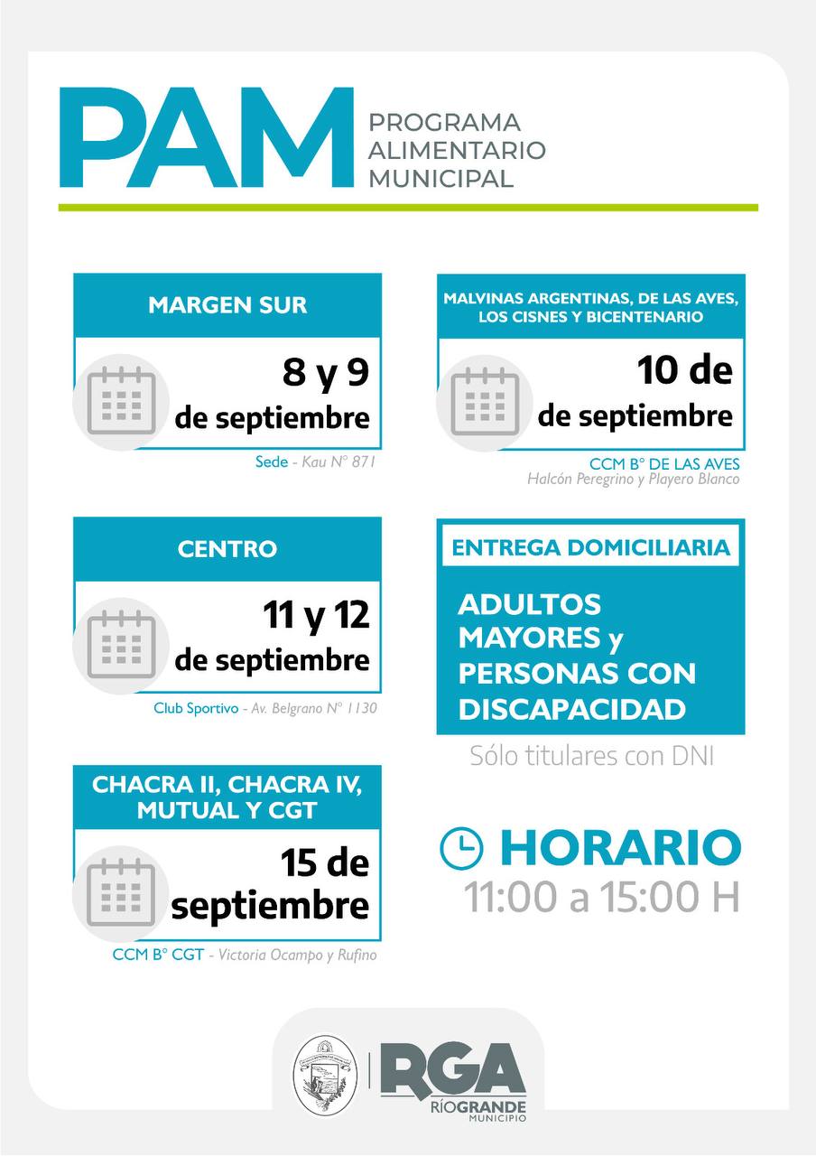El Municipio de Río Grande recuerda a los vecinos y vecinas que este lunes 8 de septiembre comenzará la distribución de los módulos alimentarios en diferentes puntos de la ciudad, destinada a quienes están empadronados en el Programa Alimentario Municipal.