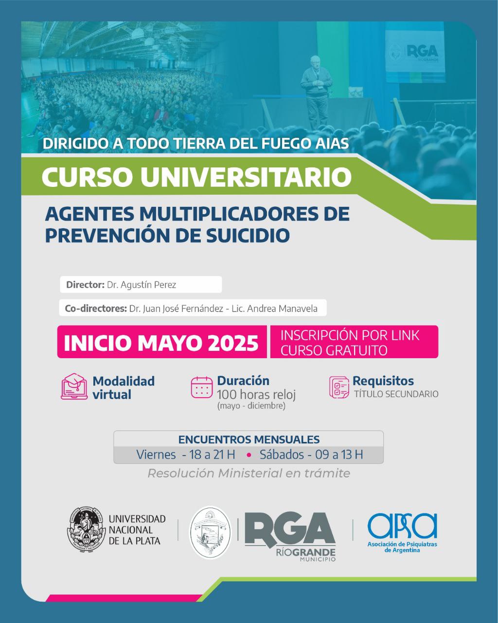 En una articulación sin precedentes, el Municipio de Río Grande, la Universidad Nacional de La Plata (UNLP) y el Capítulo de Suicidología de la Asociación de Psiquiatras de Argentina (APSA) ponen en marcha el Curso Universitario Anual de Formación de Agentes Multiplicadores en Prevención del Suicidio. Esta propuesta destinada a las comunidades de Río Grande, Tolhuin y Ushuaia está orientada a fortalecer la prevención y el abordaje comunitario de esta problemática de salud pública. Se desarrollará de manera virtual y gratuita. Las inscripciones comenzarán en los próximos días.