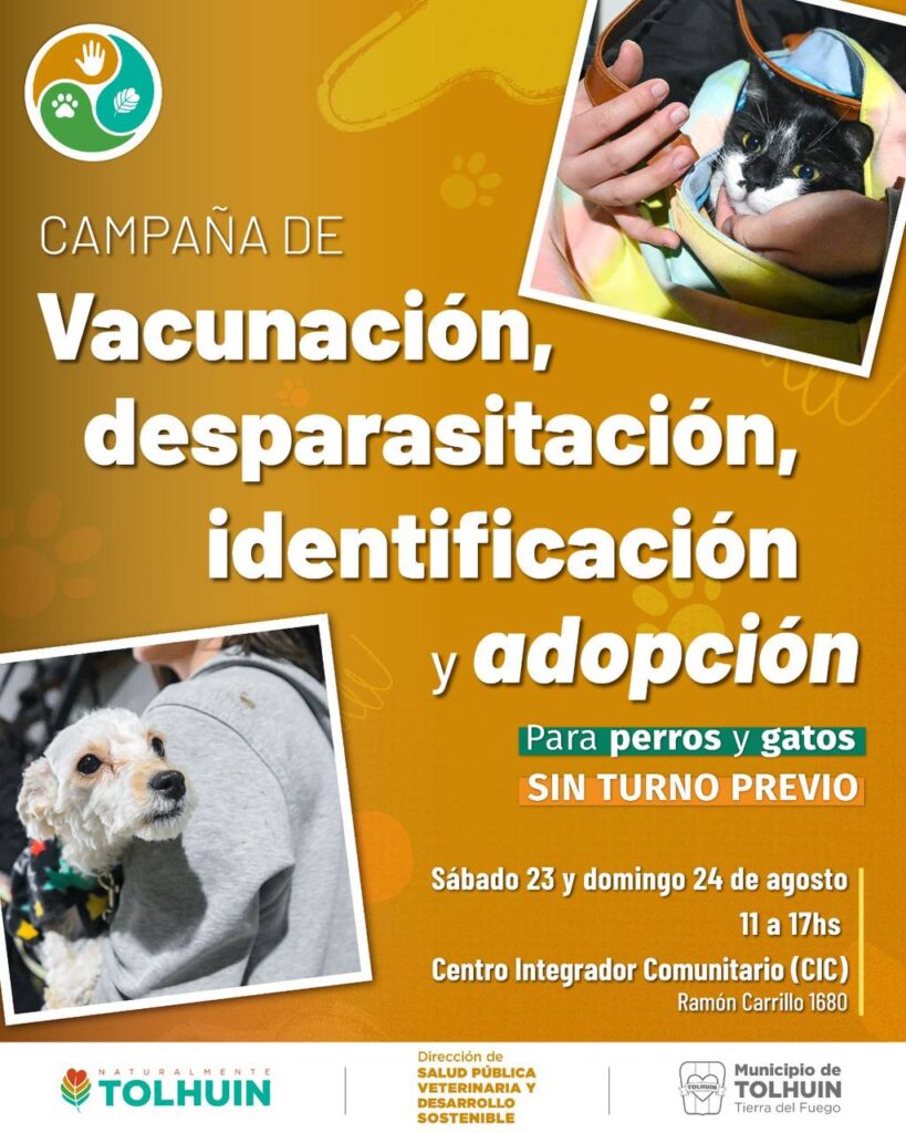 Este fin de semana, el Municipio de Tolhuin llevará adelante una nueva edición de la jornada de Tenencia Responsable y Bienestar Animal. La actividad tendrá lugar el sábado 23 y domingo 24 de agosto en el CIC, ubicado en Ramón Carrillo 1680, en el horario de 11 a 17 horas. La atención será gratuita y por orden de llegada.