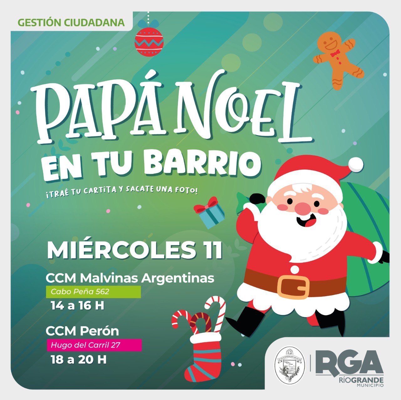 Del miércoles 11 al jueves 19 de diciembre, el Municipio de Río Grande estará presente con Papá Noel en los distintos barrios de la ciudad. De esta manera, las infancias podrán saludarlo, tomarse fotografías con él y renovar su espíritu navideño.