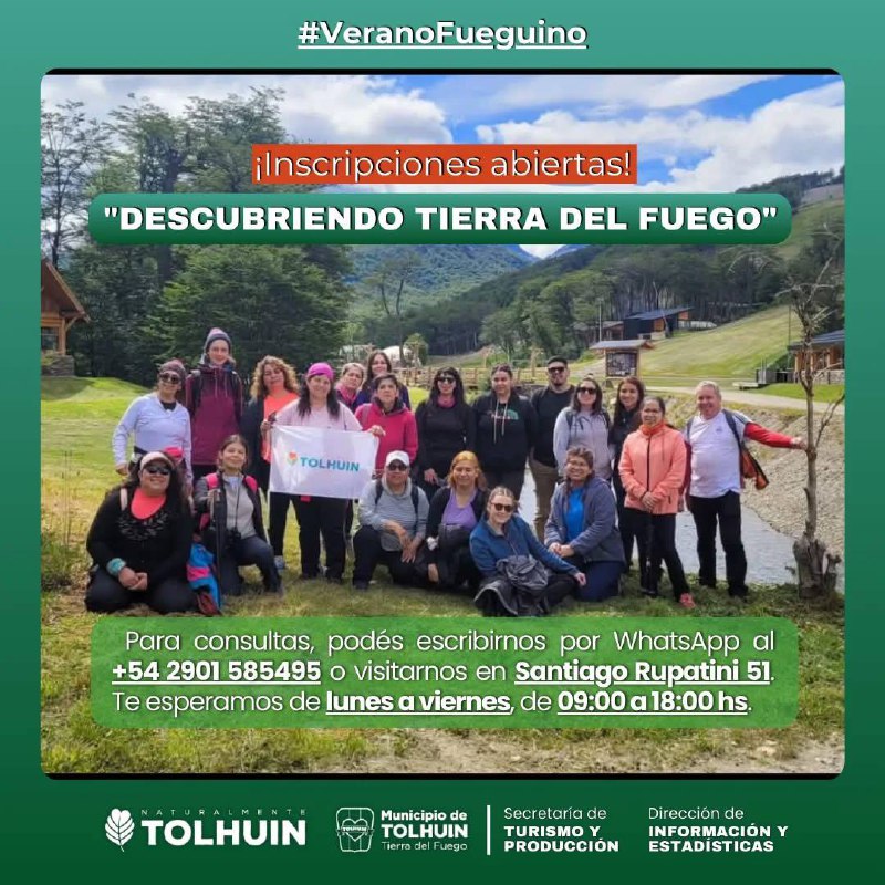 Con el cierre de las actividades de enero, el programa “Descubriendo Tierra del Fuego” se prepara para nuevas aventuras en febrero. Las inscripciones ya están abiertas y los interesados pueden elegir entre las salidas disponibles completando el formulario cuyo link estáen las redessociales del Municipio. Desde la Secretaría de Turismo y Producción recomiendan leer detenidamente el formulario antes de completarlo, ya que los cupos son limitados.