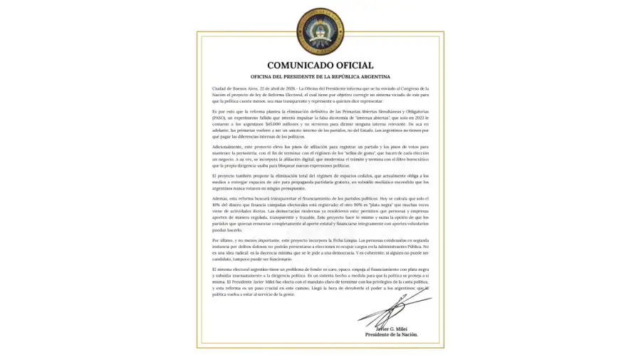 En su comunicado oficial, el Ejecutivo defendió la iniciativa señalando que busca “corregir un sistema viciado de raíz para que la política cueste menos, sea más transparente y represente a quienes dice representar”. Sobre la eliminación de las PASO, argumentó que las primarias deben volver a ser un asunto interno de los partidos y no del Estado.