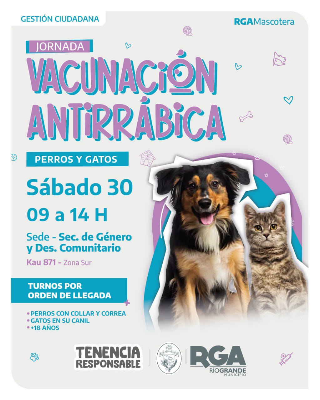 El Municipio de Río Grande, a través de la Secretaría de Gestión Ciudadana, llevará adelante una nueva jornada de vacunación antirrábica para mascotas, que se realizará el sábado 30 de agosto, de 9 a 14 horas, en la sede de la Secretaría de Género y Desarrollo Comunitario de zona sur, ubicada en Kau 871.