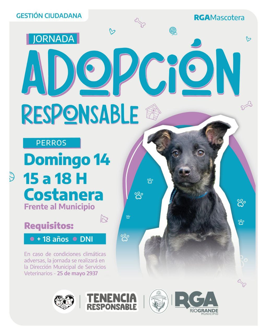 El Municipio de Río Grande, a través de la Secretaría de Gestión Ciudadana, invita a la comunidad a participar de una nueva Jornada de Adopción Responsable, que tendrá lugar este domingo 14 de diciembre, de 15 a 18 horas, en la Costanera, frente a la Casa de la Cultura.