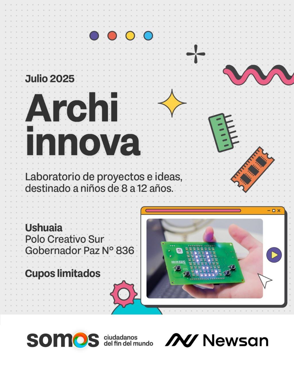 La propuesta se desarrollará en el Polo Creativo Sur de la ciudad de Ushuaia, a partir del 14 de julio, de 9 a 12 h. o de 15 a 18 h. Los asistentes contarán con el acompañamiento de docentes especializados del Polo Creativo y del equipo técnico de Newsan.