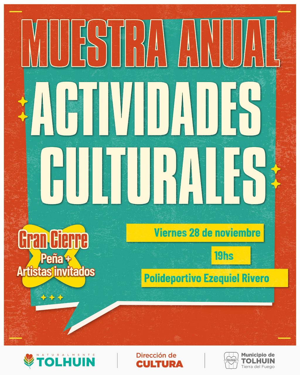 Este viernes 28 a las 19 hs, se llevará adelante la Muestra Anual de Actividades Culturales 2025, un evento que reúne a vecinos, artistas, familias y espacios de formación para celebrar el trabajo que se desarrolla durante todo el año en el ámbito cultural y comunitario. La actividad volverá a transformarse en un punto de encuentro para la comunidad tolhuinense.