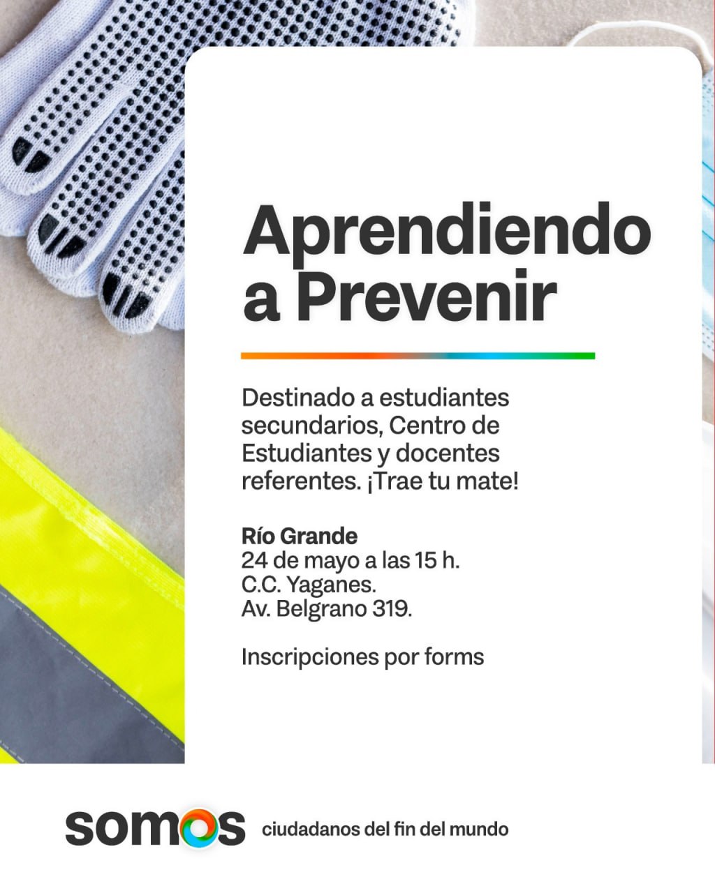 El Ministerio de Educación de la provincia de Tierra del Fuego, AeIAS realizará la jornada “Aprendiendo a Prevenir” destinada a estudiantes secundarios, Centros de Estudiantes, docentes referentes y a la comunidad en general. La propuesta será el sábado 24 de mayo a las 15 horas en el Centro Cultural Yaganes de Río Grande (Belgrano 319).