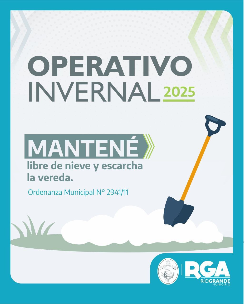 El Municipio de Río Grande recuerda a los vecinos y vecinas que, según estipula la Ordenanza Municipal N° 2941/11, cada frentista tiene la obligación de mantener las veredas de sus hogares o comercios libres de nieve, hielo o escarcha, con el objetivo de facilitar el tránsito peatonal y prevenir posibles incidentes entre quienes transiten por la zona.