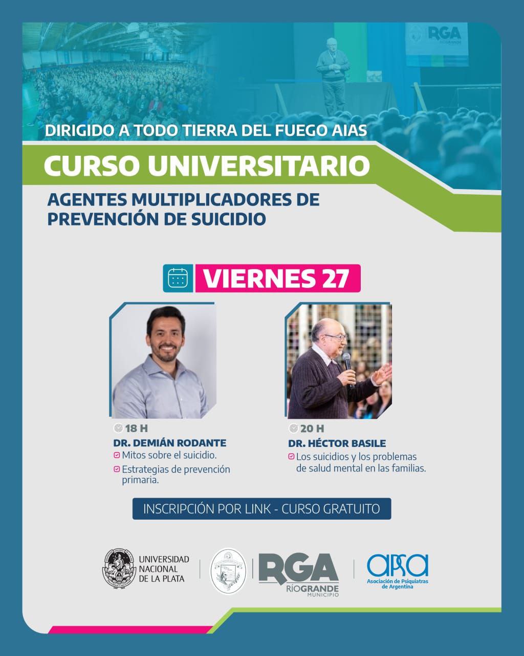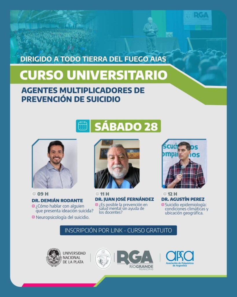 El Municipio de Río Grande, junto a la Universidad Nacional de La Plata (UNLP) y el Capítulo de Suicidología de la Asociación de Psiquiatras de Argentina (APSA), continúa promoviendo políticas públicas para el cuidado de la salud mental de la comunidad. En este marco, se llevará adelante el segundo encuentro del Curso Universitario Anual de Formación de Agentes Multiplicadores en Prevención del Suicidio, una propuesta que ya cuenta con más de 3400 inscriptos de toda la provincia y que aún mantiene abiertas sus inscripciones.