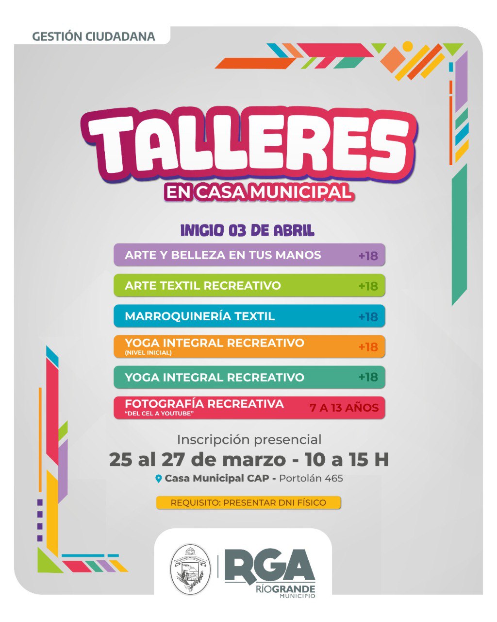 El Municipio de Río Grande acerca diferentes propuestas para que los vecinos y vecinas de zona sur puedan encontrarse y disfrutar en comunidad. Las inscripciones se realizarán de manera presencial desde el 25 al 27 de marzo, en Portolán 465, en el horario de 10 a 15 horas. Se solicita presentar DNI físico.