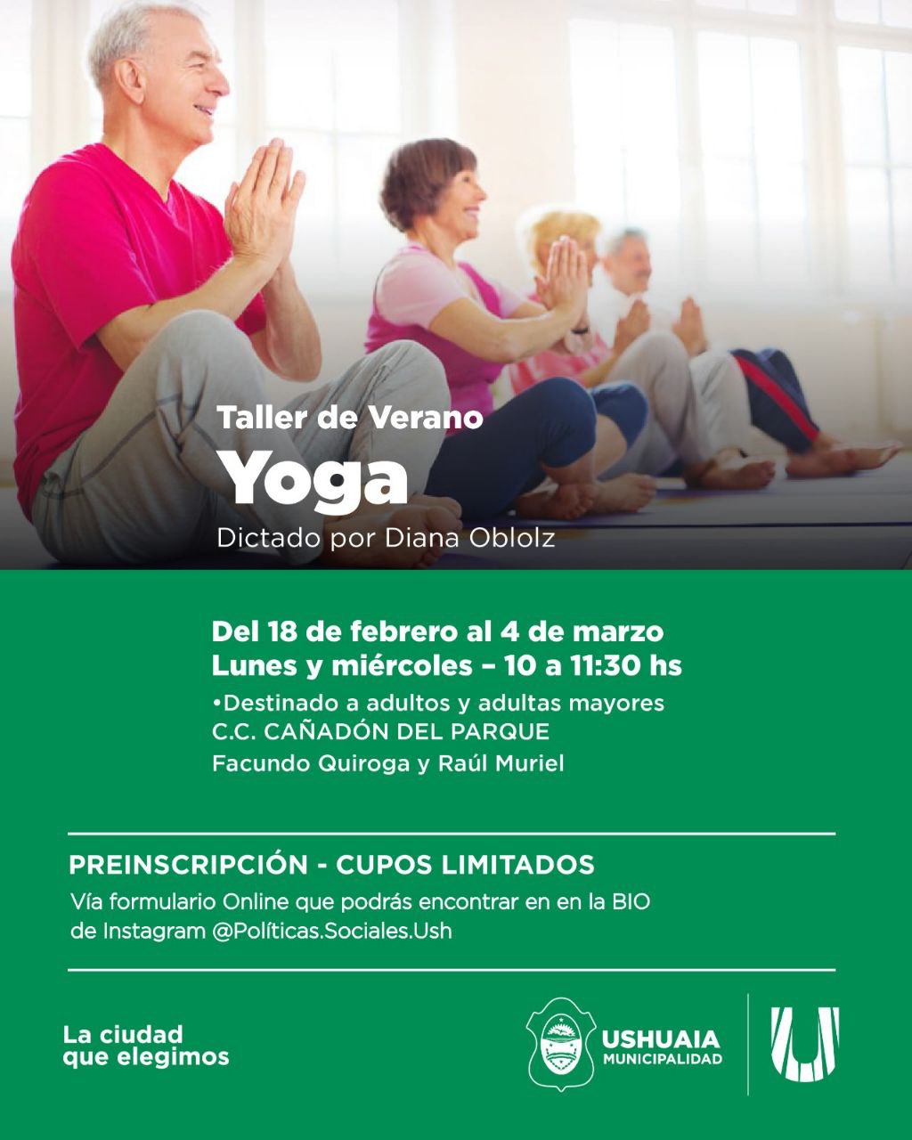 La Secretaría de Políticas Sociales, Sanitarias y Derechos Humanos de la Municipalidad de Ushuaia lleva adelante un Taller de Verano de Yoga destinado a adultos y adultas mayores, que se desarrollará en el Centro Comunitario Municipal Cañadón del Parque.
