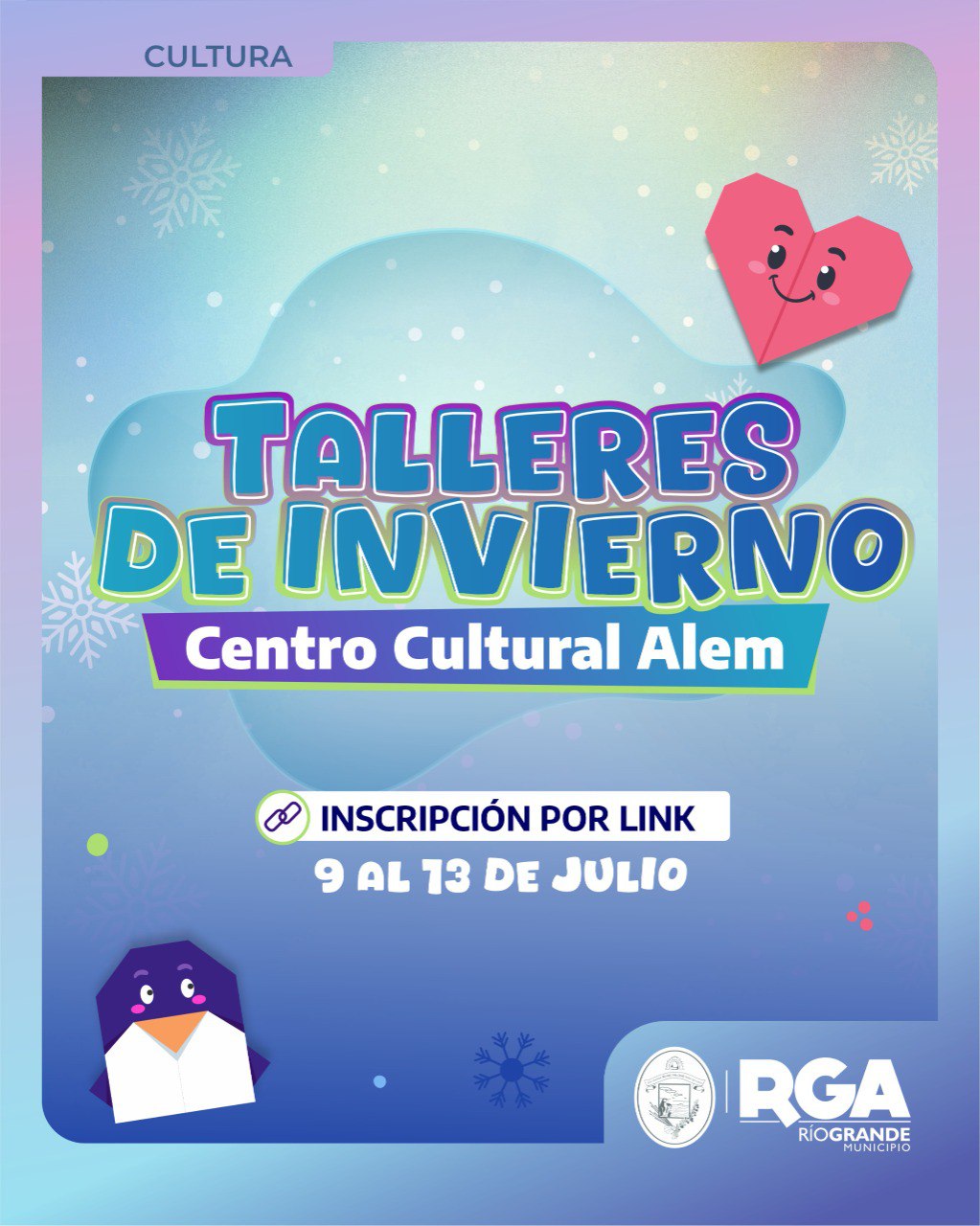 En el marco del receso invernal, el Municipio -a través de la Subsecretaría de Cultura- acerca a las infancias, adolescencias y juventudes riograndenses una serie de talleres para que puedan compartir y pasar buenos momentos junto a sus pares. Los mismos se desarrollarán en el Centro Cultural Leandro N. Alem, desde el lunes 14 de julio. Las inscripciones son online y comienzan este miércoles 9 de julio.