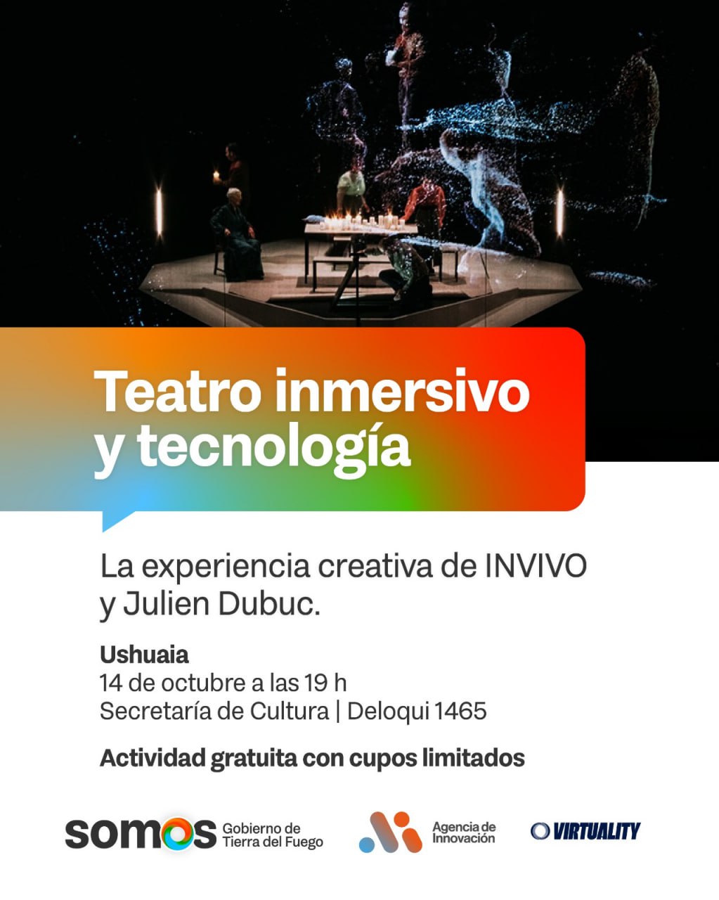La Secretaría de Cultura de Tierra del Fuego, junto a Virtuality y la Alianza Francesa de Ushuaia, invitan a la masterclass del director francés Julien Dubuc, creador y referente de la compañía INVIVO, que se realizará el martes 14 de octubre a las 19 horas en Deloqui 1465, Ushuaia, con entrada libre y gratuita.