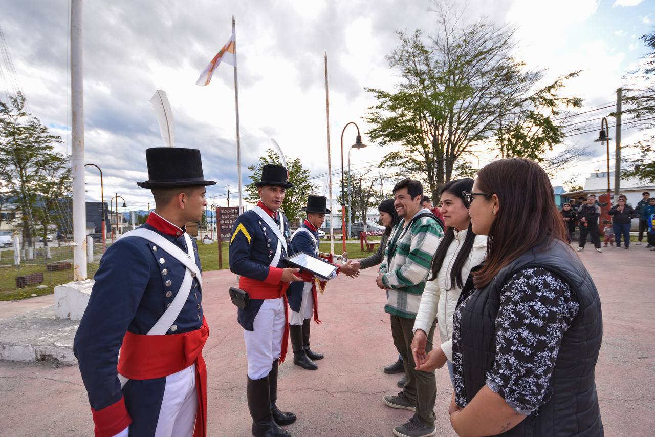 Posteriormente, en la Plaza Cívica «Corazón de la Isla», se llevó a cabo un acto protocolar al que asistieron el intendente Daniel Harrington, la secretaria de Gobierno Ana Paula Cejas, la Secretaria de Administración y Abordaje Territorial Valeria Sandoval, la concejal Florencia Auat y el Director de Cultura Alejandro Machuca; quienes entregaron un reconocimiento al Regimiento de Infantería 1 Patricios, destacando su visita como un ejemplo de compromiso y sacrificio fundamental en la consolidación de la independencia argentina.