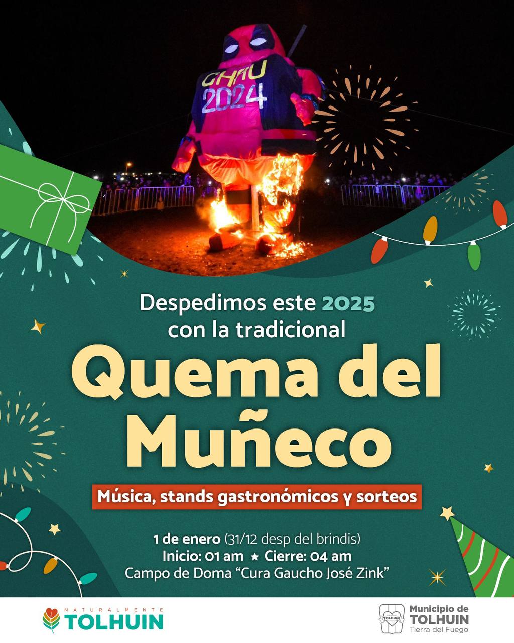 Tolhuin despedirá el año con una nueva edición de la Quema del Muñeco, una de las tradiciones comunitarias más esperadas y arraigadas de la ciudad, que convoca cada año a vecinos, vecinas y visitantes en un encuentro cargado de simbolismo, celebración y renovación.