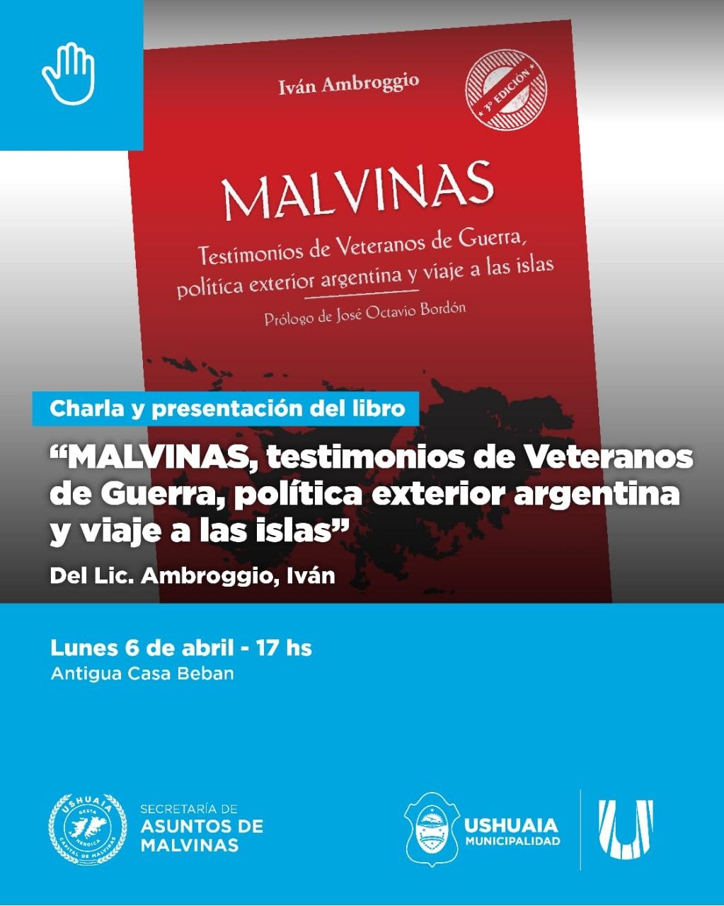 La Municipalidad de Ushuaia, a través de la Secretaría de Asuntos Malvinas, invita a la comunidad a participar de la presentación del libro “Malvinas, testimonios de veteranos de guerra, política exterior argentina y viaje a las islas”, a cargo del Lic. Iván Ambroggio.