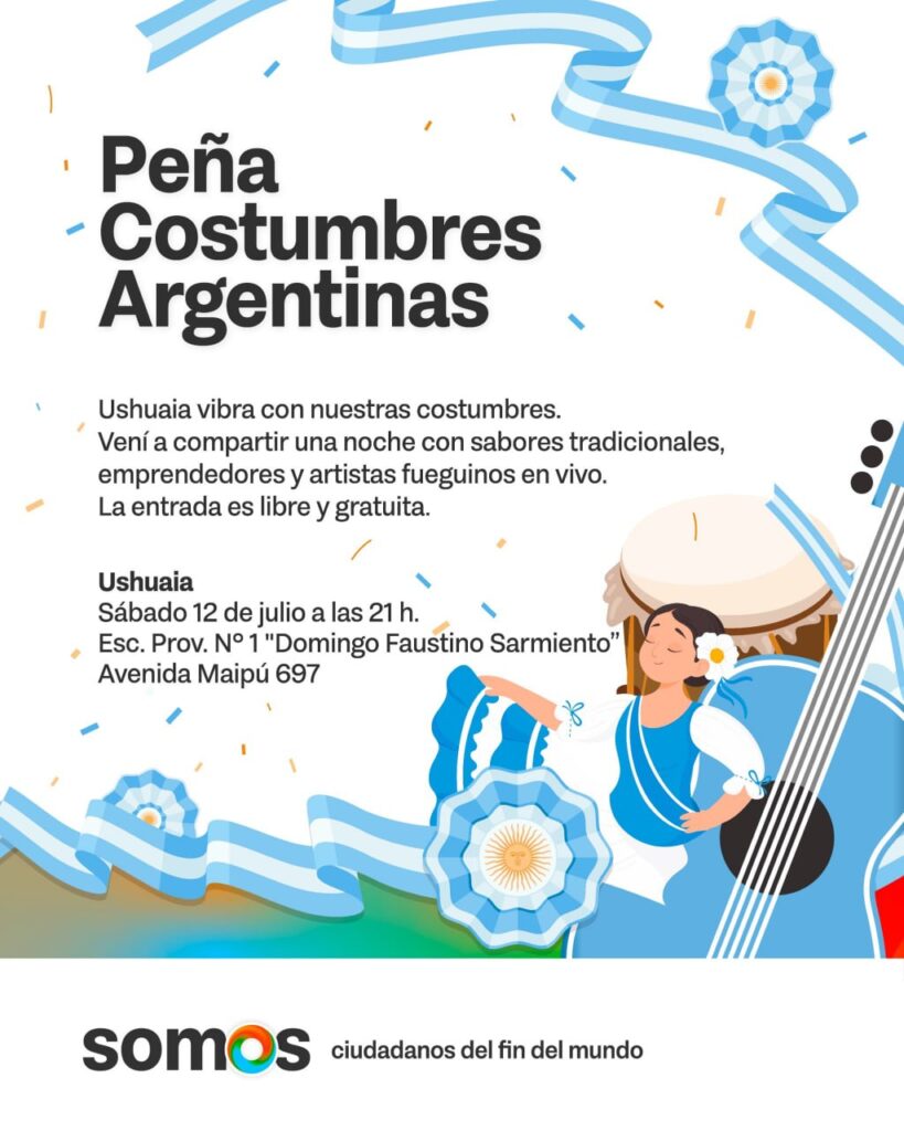 El Gobierno de la Provincia de Tierra del Fuego AIAS, a través de la Secretaría de Políticas para las Juventudes, invita a toda la comunidad a participar de una nueva edición de la Peña Costumbres Argentinas, un evento que se ha consolidado como un punto de encuentro familiar y de celebración de nuestra cultura.