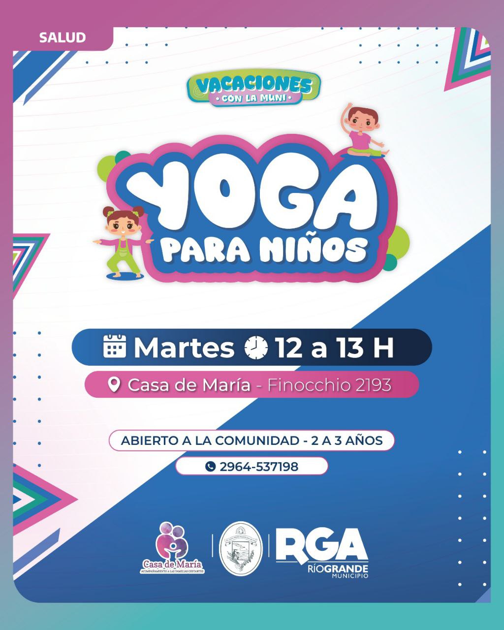 El Municipio de Río Grande, invita a las familias a participar de la propuesta “Yoga para niños”, una actividad de verano destinada a niñas y niños de 2 a 3 años, que se llevará adelante en Casa de María.